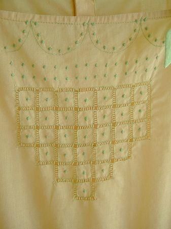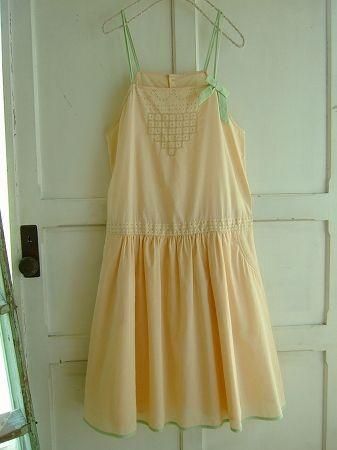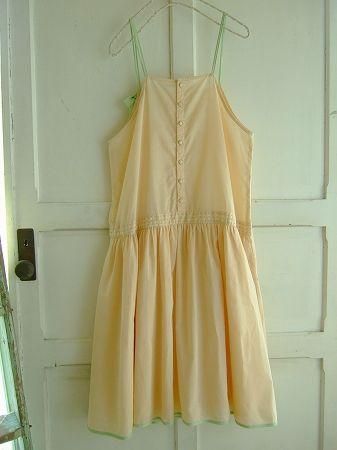 color ピンクベージュ、グリーン、素材 cotton100%、made in China、size F、 着丈102cm(肩ひも含みます)、バスト90cm、肩幅38cm、※裏地は付いておりません。スカート部分は同生地が2枚重ねになっています。リボンはブローチになっておりますのでお好みの場所へどうぞ・・・。