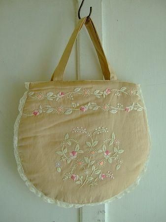 color ベージュ、素材 cotton50%、Linen25%、silk25%、(裏地 ポリエステル100%)、made in China、size 27×29cm、(持ち手31cm)、※中に綿が入っております。