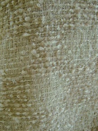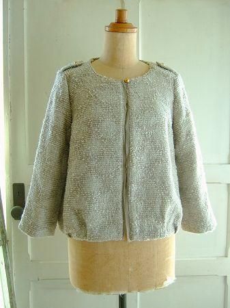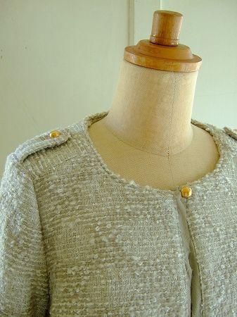 color グレー、オフホワイト、シルバー、素材 ウール52%、アクリル34%、ポリエステル8%、テンセル4%、ナイロン2%、(別地 シルク100%、/ 裏地 ポリエステル100%)、made in China 、size 38、着丈49cm、バスト106cm、袖丈48cm、肩幅38cm
