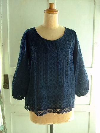 color ネイビー、素材 cotton100%、(レース部分)cotton100%、made in China、size 38、着丈55cm、バスト115cm、袖丈50cm(切替しより35cm)、肩幅38cm