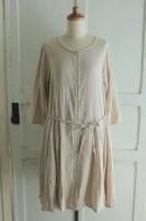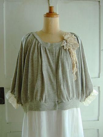 color グレー、アイボリー、素材 コットン40%、レーヨン(モダール)40%、ウール20%、(レース コットンn100%)、made in Japan、size F、着丈49cm、バスト フリー、袖丈39cm、肩幅38cm、※コサージュはピンが付いており取り外し可能です。お好みの場所へどうぞ・・・。フロント部分は大きめのスナップボタン(5つ)が付いています。