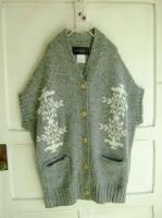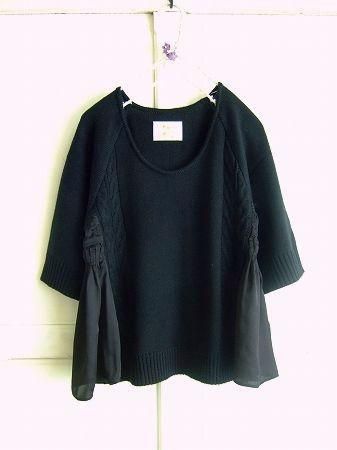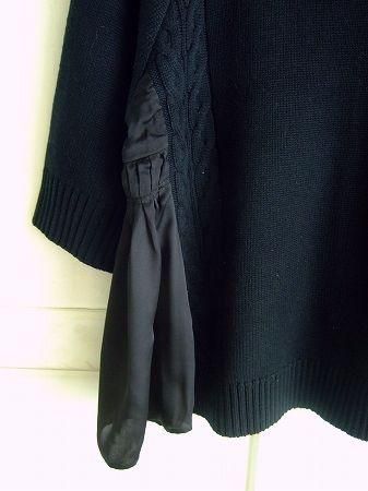 color ブラック、素材 cottonアクリル50%、ナイロン30%、ウール20%、(別布 レーヨン100%)、made in China 、size 38、着丈54cm、バスト92cm、袖丈34cm、肩幅38cm、※サイドがタックを施したサテンの切替しとなっています。