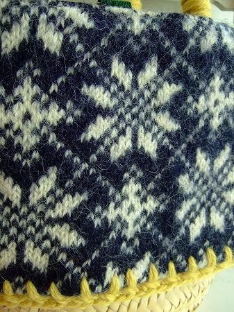 color ナチュラル、ネイビー、イエロー、グリーン、素材 シーグラス、ウール、made in Japan、size (底)17×18cm、高さ25cm、横幅42cm、持ち手25cm、※スノーモチーフのニット部分はイタリアの手編みのセーターの古着をリメイクしたものとなります。