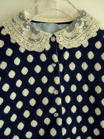 color ネイビー、アイボリー、素材 wool100%、(襟部分 ナイロン100%)、made in China、size F、 着丈55cm、バスト94cm、袖丈58cm、肩幅38cm、※チュールレースの付け襟はボタンで留まっております為、取り外しが可能です。ベロアのリボンブローチ付きです。