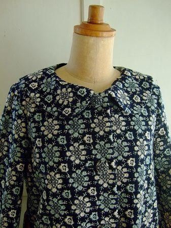 color ネイビー、(刺繍 ブルー、オフホワイト)、素材 ウール100%、(刺繍糸 ウール50%、アクリル50% / 別地 コットン100% / 裏地ポリエステル100%)、made in Japan、size F、 着丈89cm、バスト98cm、袖丈51cm、肩幅38cm、※襟部分はボタンで留まっております為、取り外しが可能です。