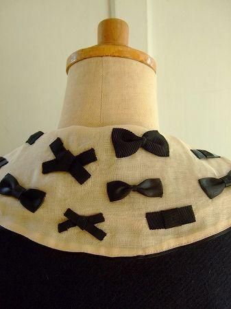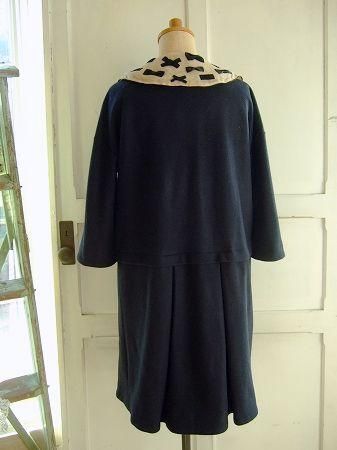color ネイビー、ベージュ、ブラック、素材 ウール65%、アンゴラ20%、、ナイロン15%、(裏地 ポリエステル100%、付け襟コットン100%)、made in Japan、size F、着丈90cm、バスト98cm、袖丈43cm(切替しより32cm)、肩幅38cm、※リボンいっぱいの付け襟はボタンで留めております為、取り外し可能です。