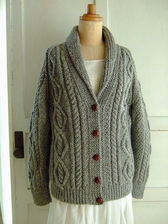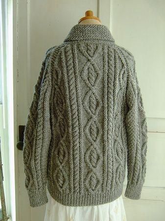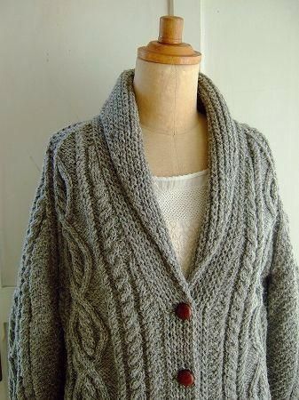 color グレー、素材 wool100%、made in Scotland、size 着丈65cm、バスト96cm、袖丈63cm、肩幅38cm、※こちらは手編みのニットとなります。