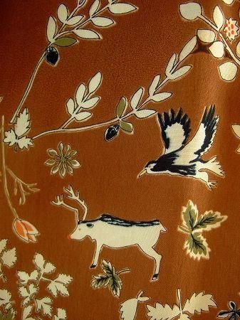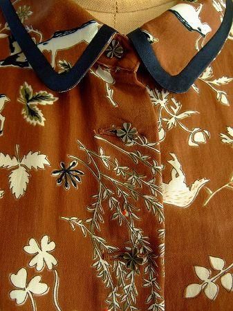 color ブラウン、素材 キュプラ100%、(別布部分)シルク100%、(裏地)ポリエステル100%、made in China、size 38、着丈94cm、バスト94cm、袖丈60cm、肩幅38cm、※裏地はスカート部分のみとなりましてトップには付いておりません。