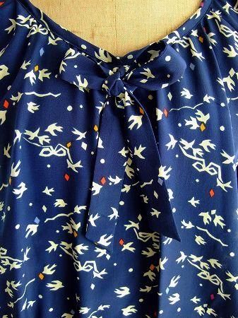 color ネイビー、オフホワイト、素材 silk100%、(裏地 ポリエステル100%)、made in China、size 38、着丈95cm、バスト88cm、袖丈43cm、肩幅38cm