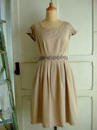 color ベージュ、素材 コットン55%、シルク45%、(裏地 ポリエステル100%、ウエスト部分飾り ポリエステル100%)、made in China、size 38、着丈92cm、バスト85cm、袖丈11cm、肩幅38cm