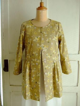 color ベージュ、イエロー、パープル、素材 コットン100%、(裏地)ポリエステル100%、made in China、size 38、着丈68cm、バスト90cm、袖丈46cm、肩幅38cm、※フロント部分は大きめのスナップボタン5つで留めて頂くデザインとなっております。