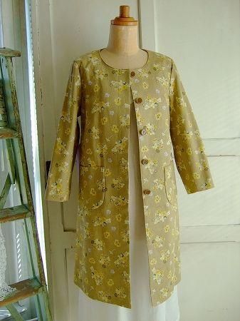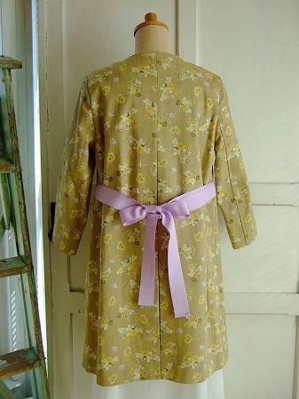 color ベージュ、イエロー、パープル、素材 コットン100%、(裏地)ポリエステル100%、made in China、size 38、着丈85cm、バスト92cm、袖丈47cm、肩幅38cm、※フロント部分はブラウンベージュのボタン5つで留めて頂くデザインとなっております。