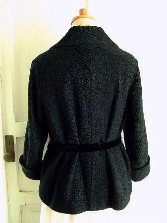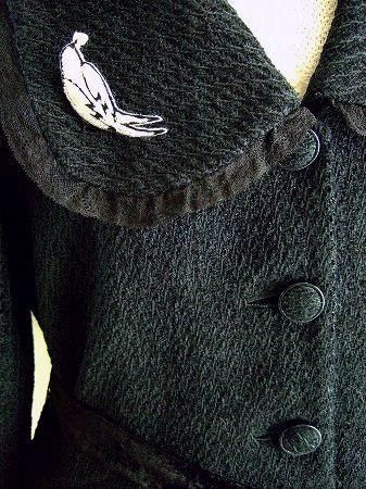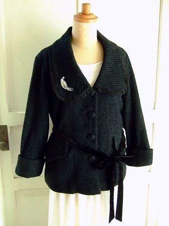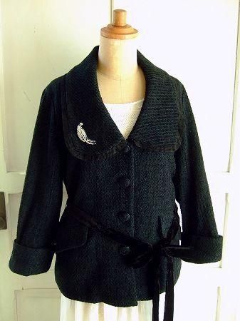 color ブラック、素材 リネン53%、ウール25%、コットン22%、(裏地 ポリエステル100%)、made in China、size 38、着丈60cm、バスト94cm、袖丈48cm、肩幅38cm、※ビーズ刺繍のコトリブローチとベロアのリボン付きです。