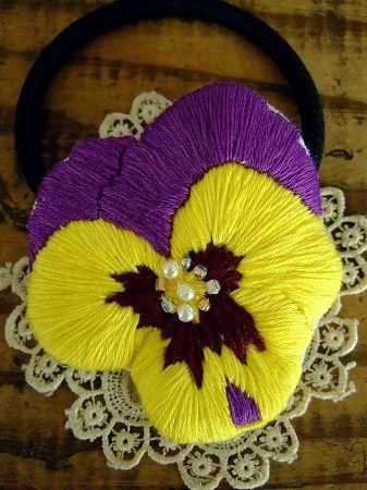 color パープル、イエロー、素材 コットン、ピーズ、made in China、size (パンジーモチーフ)直径5.5cm
