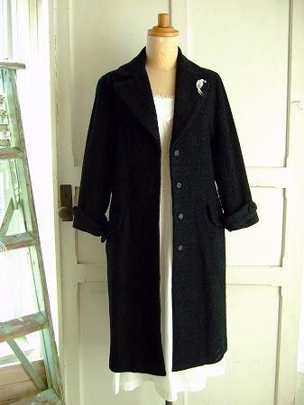 color ブラック、素材 リネン53%、ウール25%、コットン22%、(裏地 ポリエステル100%)、made in China、size 38、着丈92cm、バスト94cm、袖丈49cm、肩幅38cm、※ビーズ刺繍のコトリブローチとベロアのリボン付きです。フロント部分は大きめのスナップボタン4つで留めて頂くデザインとなっております。