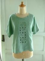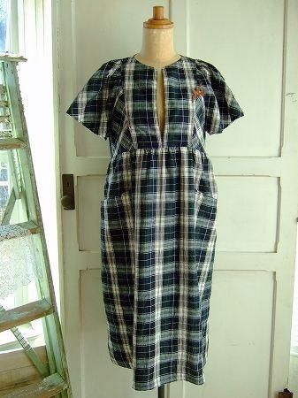 color ネイビー、グリーン、オフホワイト、レッド、素材 Linen100%、(別布 cotton100%)、made in Japan、size 38、着丈102cm、バスト98cm、袖丈20cm、肩幅38cm、※裏地は付いておりません。レザーのコトリブローチ付きです。