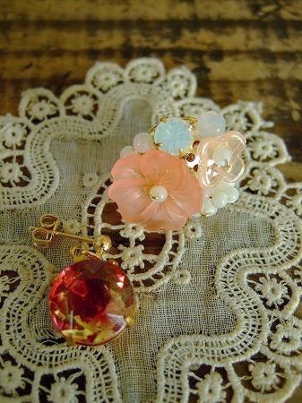 color サーモンピンク、ホワイト、ゴールド、素材 真鍮、アクリルビーズ、made in JAPAN、size (フラワー)直径2cm、/(左)全長1.7cm、※マザーオブパール、一部ヴィンテージパーツ使用。