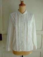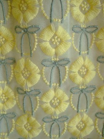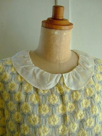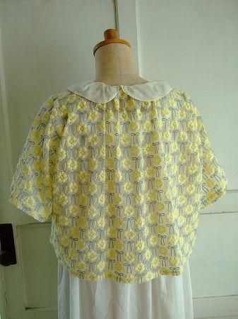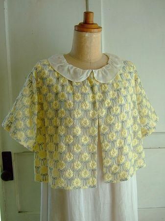 color オフホワイト、(刺繍 イエロー×パープル)、素材 ポリエステル100%、(刺繍糸 コットン100%、襟部分 コットン65%、シルク35%)、made in Japan、size F、着丈44cm、バスト108cm、袖丈25cm、肩幅38cm、※裏地は付いておりません。フロント部分には鍵ホックが3つ付いています。