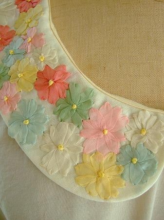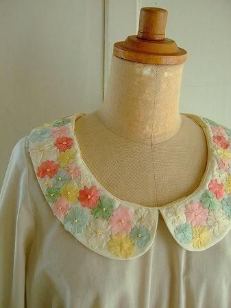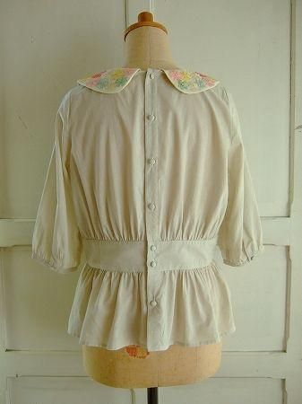 color ライトグレー、オフホワイト、素材 cotton100%、made in China、size F、着丈54cm、バスト96cm、袖丈38cm、肩幅38cm、※フラワーリボン刺繍の付け襟はスナップボタンで留まっております為、取り外しが可能です。
