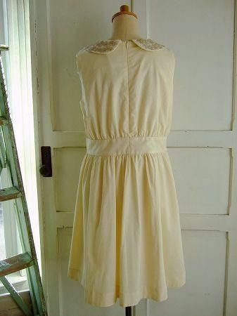 color クリーム、オフホワイト、素材 cotton100%、(裏地 ポリエステル100%)、made in China、size F、着丈93cm、バスト94cm、肩幅38cm、※フラワーリボン刺繍の付け襟はスナップボタンで留まっております為、取り外しが可能です。背中にファスナーが付いております。
