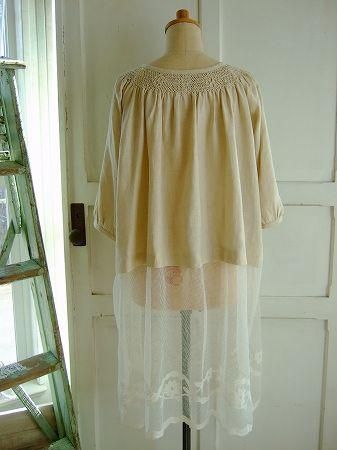 color ベージュ、アイボリー、素材 Linen100%、(別地 cotton100%)、made in China、size F、着丈95cm(トップ48cm)、バスト116cm、袖丈43cm、肩幅38cm、※裏地は付いておりません。