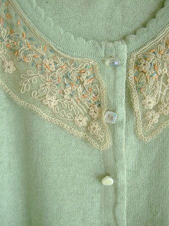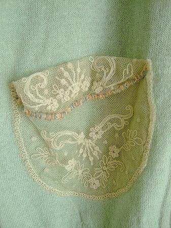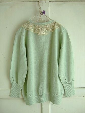 color ミント、アイボリー、(ステッチ ブルー、ピンク)、素材 コットン70%、リネン30%、(チュール部分 ナイロン100%)、made in China、size F、 着丈53cm、バスト94cm、袖丈46cm、肩幅38cm