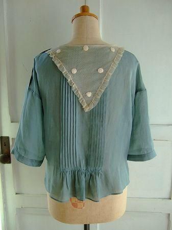 color グリーン、ベージュ、素材 Linen100%、(別地 ナイロン100%)、made in China、size F、着丈54cm、バスト96cm、袖丈35cm、(切替しより26cm)、肩幅38cm、※ドットの刺繍が施された襟は縫い留まっております為、取り外しが不可となります。左肩にスナップボタンが4つ付き脱ぎ着が簡単です。