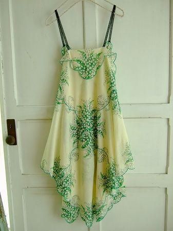 color アイボリー、グリーン、オフホワイト、素材 cotton100%、made in China、size F、着丈(最長部分)107m(肩ひも含みます)、バスト102cm、肩幅38cm、※裏地は付いておりません。こちらはハンカチ約9枚分がパッチワークされています。