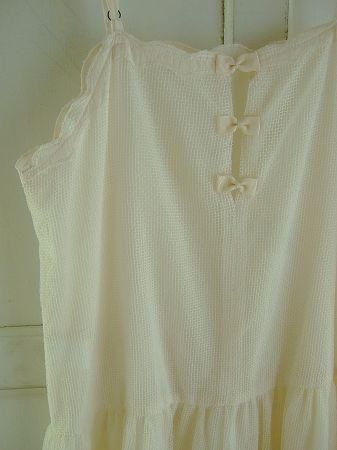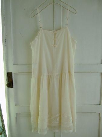color アイボリー、素材 cotton100%、(裏地 cotton100%)、made in China、size F、着丈104cm(肩ひも含む最長)、バスト90cm、肩幅38cm、※肩ひもにアジャスターが付いておりますので、長さの調節が可能です。