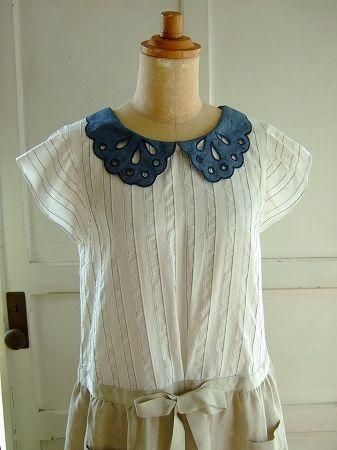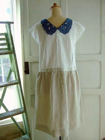 color オフホワイト、ナチュラル、ブルー、素材 cotton85%、Linen15%、(別布 Linen100%、襟部分 cotton100%)、made in China、size 38、着丈102cm、バスト92cm、袖丈8cm、肩幅38cm、※裏地は付いておりません。襟部分はボタンで留まっております為、取り外しが可能です。