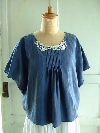 color ブルー(グレーがかった落ち着いたブルーです)、素材 リネン54%、テンセル46%、(レース部分)コットン100%、made in China、size 38、着丈52cm、バスト フリー、袖丈25cm(切替しより21cm)、肩幅38cm、身幅が広くドルマンスリーブのゆったりシルエットです。