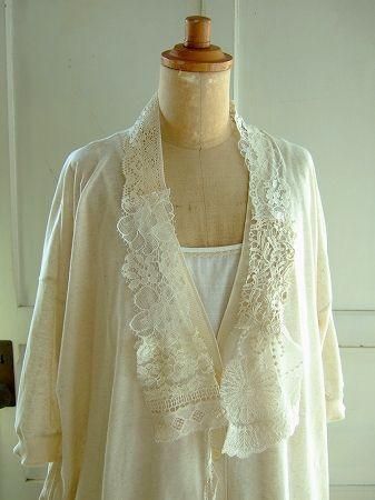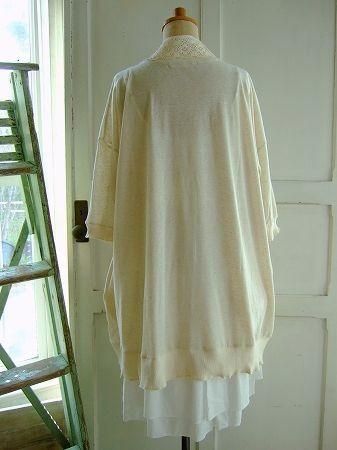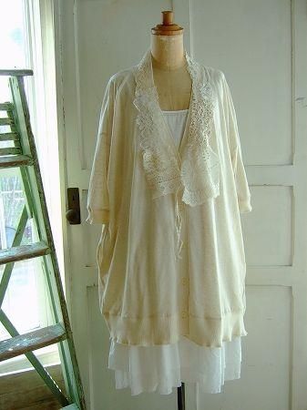color アイボリー、素材 cotton80%、Linen20%、(レース コットン、ナイロン)、made in Japan、size F、着丈84cm、バスト155cm、袖丈43cm(切替しより26cm)、肩幅38cm、※レースショールは取り外し可能です。