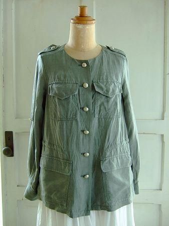 color カーキ、素材 リネン50%、リヨセル50%、made in Japan 、size 38、着丈64cm、バスト103cm、袖丈58cm、肩幅38cm、※裏地は付いておりません。