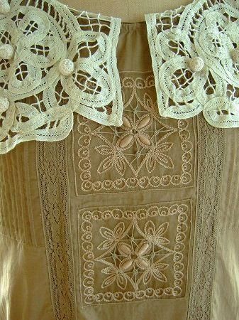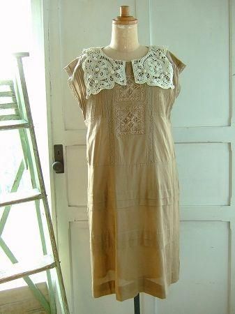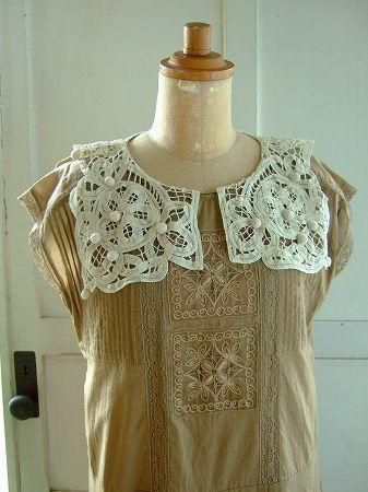 color ベージュ、アイボリー、素材 cotton100%、(アンダードレス アセテート100%)、made in China、size F、着丈94cm、バスト100cm、袖丈9cm、肩幅38cm、※バテンレース襟はスナップボタンで留まっております為、取り外しが可能です。セパレートタイプのアンダードレス付きです。