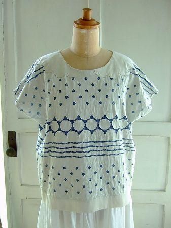 color アイボリー、ブルー、素材 (表地 上)cotton100%、(表地 下)ポリエステル100%、made in Japan、size F、着丈57cm、バスト118cm、袖丈18cm、肩幅38cm、※コットンとシフォン生地を重ねてリボンモチーフのステッチを施したものに特殊な薬品で表地のコットンのみを溶かしドットやボーダーの柄を出すオパール加工という手法が施されています。