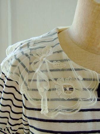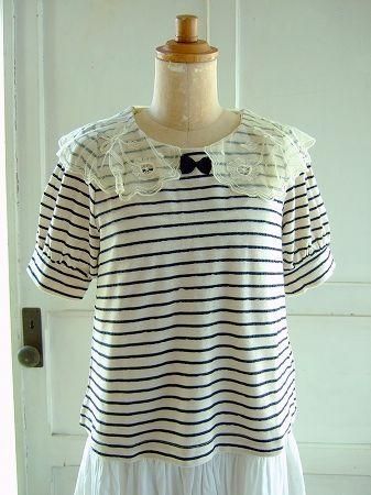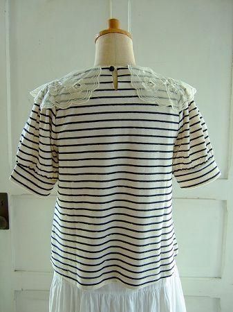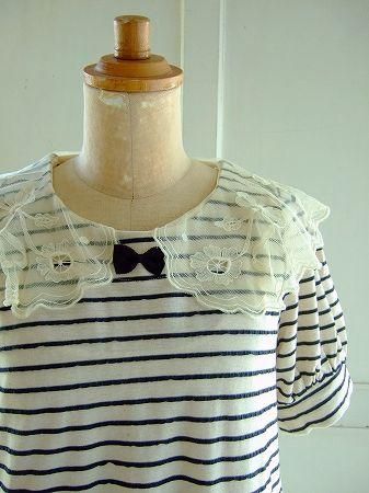 color アイボリー、ネイビー、素材 コットン76%、ポリエステル18%、リネン6%、(レース付け襟)ナイロン100%、made in Japan、size F、着丈54cm、バスト93cm、袖丈28cm、肩幅38cm、※レースの付け襟はボタンで留まっております為、取り外し可能です。
