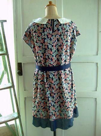 color ネイビー、オフホワイト、(刺繍糸 ブルー、オレンジ、グリーン)、素材 cotton100%、(刺繍糸 cotton100%、襟部分 cotton75%、silk25%、裾部分 cotton100%、裏地 ポリエステル100%)、made in Japan、size F、着丈92cm、バスト114cm、袖丈14cm肩幅38cm、※セパレートタイプのキャミワンピースの裏地付きです。ベルトはスナップボタンで留めて頂くデザインとなっております。