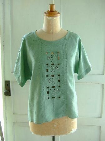 color ミントグリーン、素材 Linen100%、made in China、size F、着丈53cm、バスト104cm、袖丈24cm肩幅38cm、※裏地は付いておりません。