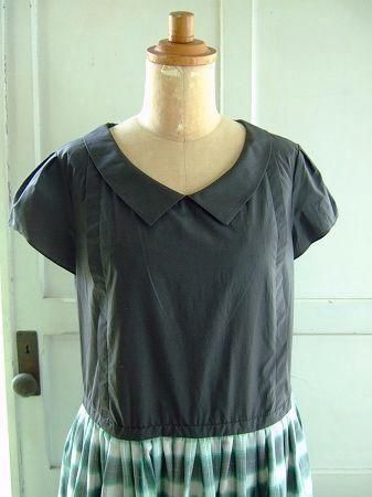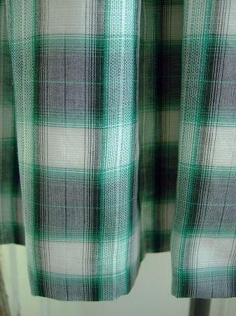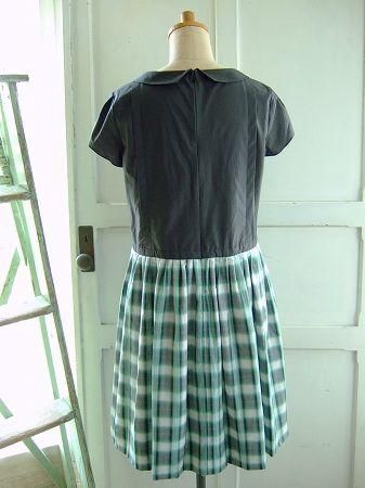 color チャコール、グリーン、素材 (トップ)コットン100%、(スカート部分)コットン77%、レーヨン22%、キュプラ1%、裏地ポリエステル65%、コットン35%、made in China、size 38、着丈95cm、バスト92cm、袖丈13cm、肩幅38cm、※スカート部分の裏地は表のチェック生地と重ねて裾で縫い止まっており厚手の1枚生地のようになっております。背中ファスナー付き。