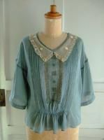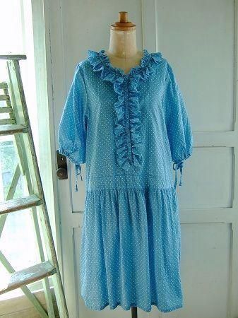 color ブルー、オフホワイト、素材 cotton100%、made in Japan、size 1、着丈100cm、バスト104cmcm、袖丈36cm肩幅38cm、※裏地は付いておりません。袖口部分にリボンが入っております。