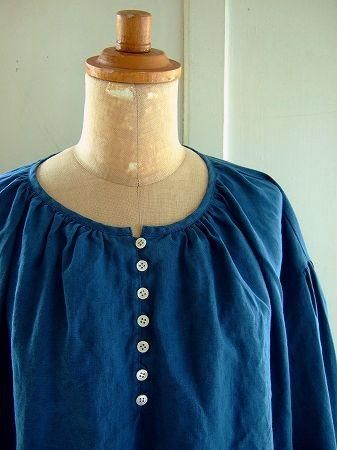 color ブルー、素材 Linen100%、made in Japan、size 2、着丈88cm、バスト136cm、袖丈50cm(切替しより42cm)、肩幅38cm、※裏地は付いておりません。