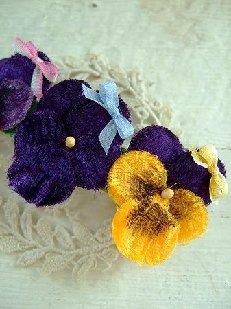 color イエロー×ライトパープル×パープル、素材 コットンなど、made in JAPAN、size (パンジー)3.5×3cm、(全長)9cm