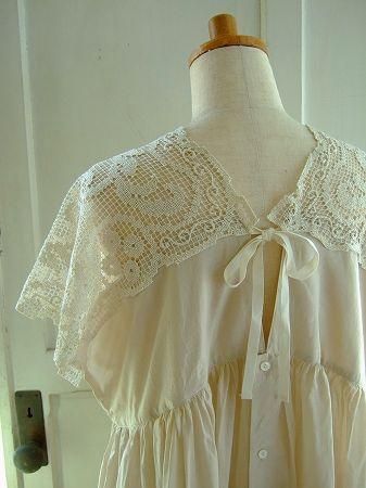 color アイボリー(ピンクがかったお色です)、(レース)アイボリー、素材 cotton100%、made in Japan、size F、着丈102cm、バスト110cm、袖丈18cm、肩幅38cm、※裏地は付いておりません。
