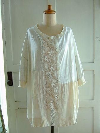 color アイボリー、オフホワイト、杢ライトグレー、素材 コットン、ナイロン、レーヨン、made in Japan、size F、着丈78cm、バスト155cm、袖丈47cm(切替しより27cm)、肩幅38cm、※カットソー生地や布帛、レースなど異素材がパッチワークされています。フロントの合わせ部分にはスナップボタンが付いています。