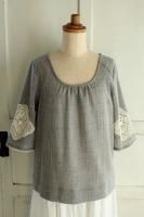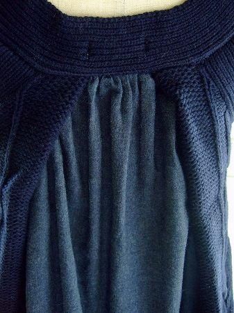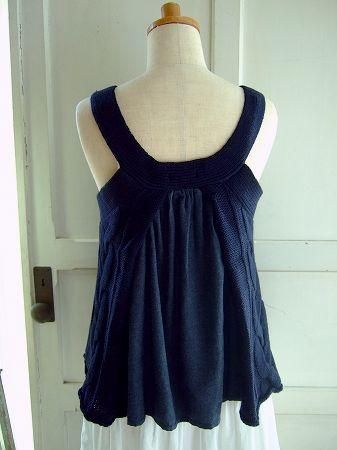 color ネイビー、素材 cotton60%、wool40%、(別布部分 cotton100%)、made in China、size M、着丈56cm(肩ひも含みます)、バスト88cm、肩幅38cm、※背中部分には異素材の起毛がかったコットン生地が施されております。