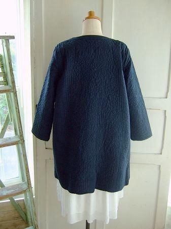 color ネイビー、素材 コットン100%、(裏地)コットン90%、シルク10%、(中綿)ポリエステル100%、made in China、size F、着丈83cm、バスト98cm、袖丈54cm、肩幅38cm
