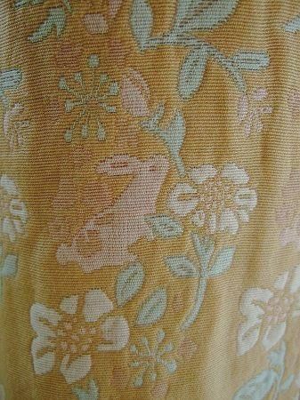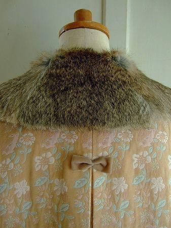 color ベージュ(サーモンピンクに近いお色です)、素材 コットン66%、キュプラ34%、(裏地)ポリエステル100%、(襟)ラビットファー、made in China、size 38、着丈58cm、バスト98cm、袖丈44cm、肩幅38cm、※ラビットファーの襟はボタンで留まっております為、取り外しが可能です。ジャケットはノーカラーのデザインとなっております。