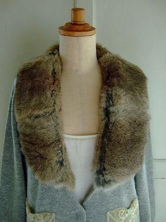 color グレー、素材 ウール100%、(襟)ラビットファー、made in China、size F、着丈56m、バスト94cm、袖丈56cm、肩幅38cm※フロント部分はスナップボタン(5つ)で留めて頂くデザインとなっております。ファーの付け襟はボタンで留まっております為、取り外しが可能です。パールビーズとフラワーレースのブローチ付きです。