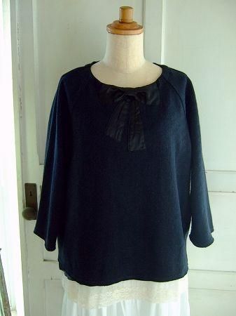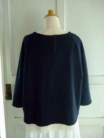 color ネイビー、素材 コットン60%、ウール30%、ナイロン10%、(別布)シルク100%、(インナー)ポリエステル100%、made in Japan、size F、着丈55m、バスト112cm、袖丈48cm、肩幅38cm、※裾にレースが施されたセパレートタイプのインナーキャミソール付きです。