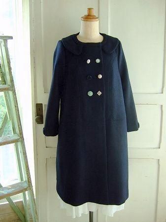 color ネイビー、素材 ウール100%、(裏地)ポリエステル100%、made in Japan、size F、着丈91m、バスト100cm、袖丈50cm、肩幅38cm、※水玉柄(アイボリー×ブラック)のかわいい裏地が施されております。袖口にリボンが施されております。